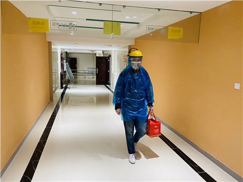 做集中隔离点的“外卖小哥”,为隔离人员配送餐食。每日的8:30、11:30和17:30为配送时间,在微信群里提醒大家领取。一日三餐工作人员去食堂领取盒饭,穿戴防护服将食物送到隔离房间门口,同时隔离人员所需的个人物品也在这个时间配送。