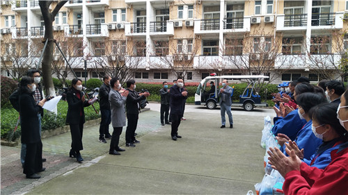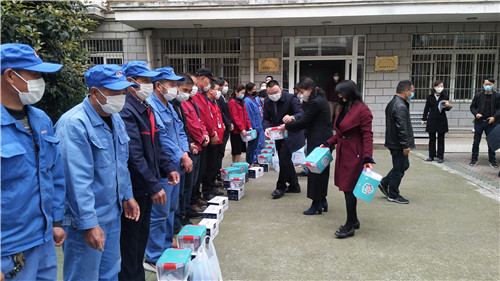 朱斌为防控一线的后勤员工们送上牛奶、健康防护包等慰问品,对大家的辛勤付出表示衷心感谢与亲切的慰问。