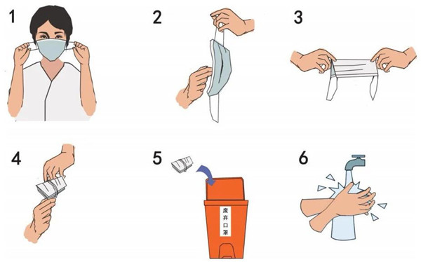 防疫期间,摘口罩前后做好手卫生。废弃口罩丢弃之前,应折叠成长条形后用挂耳绳捆绑成型,将口罩折叠时应将口鼻接触面朝外,有条件的应进行酒精消毒。废弃口罩放入垃圾桶内,每天两次使用75%酒精或含氯消毒剂对垃圾桶进行消毒处理。居家隔离者用过的口罩,请在弃置前用水煮沸10-15分钟后再投放至“其他垃圾”的收集容器中。