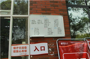 在进入食堂后,保证师生的安全用餐更加重要。要求师生在食堂内除进餐时刻,其余时候需全程佩戴口罩;食堂内设立了不同的功能专窗,1号窗口为特色餐饮专窗,2号为普通餐饮窗口,3号为外带盒饭专窗,并张贴各窗口每日菜谱,使得就餐者在排队前就计划好在哪个窗口购餐,力求尽量缩短窗口排队选餐时间。