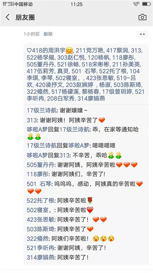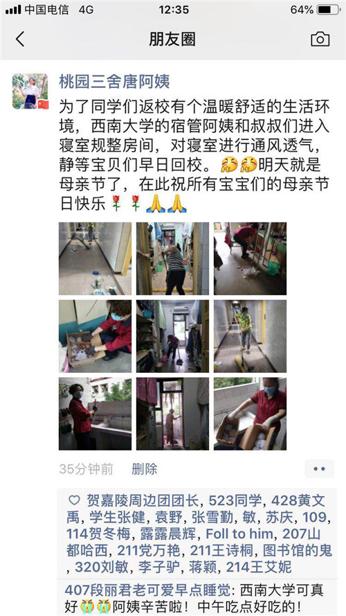 “叔叔阿姨们辛苦啦,祝阿姨们母亲节快乐,平平安安”“天呐,叔叔阿姨也太有心了吧,我们也是‘别人家的学校’了!祝阿姨们母亲节快乐!”宿管员们把做清洁的图片晒到朋友圈,引来一片大学生们的点赞。