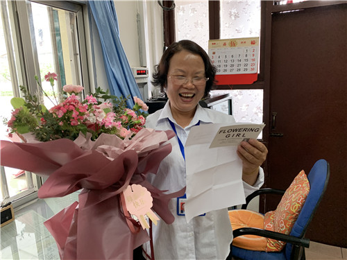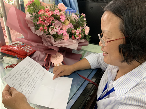 “阿姨,今天是您上班吗?一会有人来送东西,您帮我收一下呗。”5月9日一大早,西南大学学生宿舍——李园5舍的值班员杨跃洪就收到517寝室物理科学与技术学院2017级学生董思佳的消息。即将开校复学,这两天宿管阿姨收到学生们请求帮忙收快递的短信很平常。“我以为是快递,要开学了嘛,这几天宿舍群里孩子们可激动了!”出乎意料的是,杨阿姨等来的却是一束送给她的鲜花和一封亲笔信。