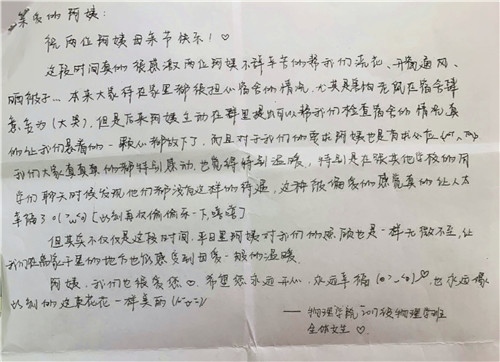 “这段时间真的很感激两位阿姨不辞辛苦地帮我们浇花、开窗通风、晒被子……”董思佳同学在信中代表住在这栋宿舍的全班女生感谢宿管阿姨,称她们是自己的“校园母亲”,值此母亲节来临之际,向“母亲”们表示祝福和感谢。董思佳同学信中说,大家待在家里这么长,都很担心宿舍情况,尤其害怕老鼠在宿舍肆意妄为,把衣物和书籍啃烂。但后来阿姨主动在群里提出可以帮我们检查宿舍,真的让我们悬着的一颗心都放下了。“对于我们的要求,阿姨也是有求必应。”