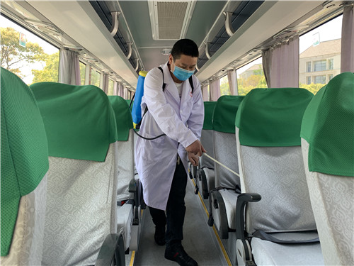 为给每一个学生提供一个安全的乘车环境,交通中心在接站期间做好每一趟车的车辆消毒工作。学生上车时,给每位学生双手喷洒免洗手消毒液,避免接触时留下病菌。学生下车后,对车厢内部进行消毒,包括驾驶室、座椅下方、行李厢,着重对学生及驾驶员接触的座椅扶手、拉杆等位置进行消毒液喷洒,并同时做好消毒记录。