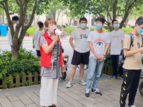 身穿志愿者红马甲,手持扩音小喇叭,时不时喊一喊“同学们,排队请保持一米距离”……自五月份开学以来,这个身影每天都会穿梭在竞秀路各营业用房之间,她是谁?她就是后勤商贸服务中心主任乐伟飞。