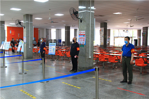 5月19日起,学校陆续迎来返校学生,中心全体班子成员、党员和管理骨干全部下沉一线,协助食堂日常执勤,在关键时刻冲锋在前、发挥作用,展现出勇于担当的风貌,成为校园疫情防控的一支重要力量。执勤工作每天六点半到岗,三餐时段共计工作六小时,学生体温检测、就餐流程引导、场地秩序维护、应急处置准备……各项工作纷繁,所有人员早出晚归,坚守岗位,无一人退缩、无一次疏漏,生动诠释了使命在我的良好品质。