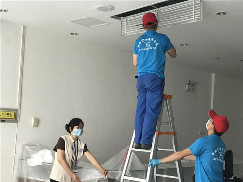 在为期11天的中央空调清洗消毒过程中,物业服务中心工作人员加班加点,任劳任怨,顺利、安全协助完成消杀工作。(刘志磊 杨桂皊)