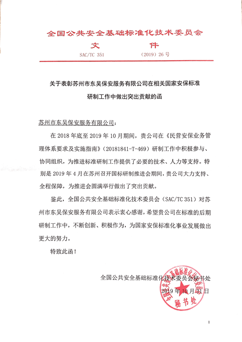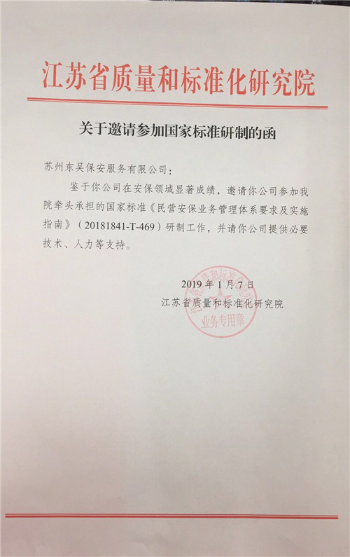 2018年10月15日,国家标准化管理委员会批准公布《民营安保业务管理体系要求及实施指南》行业标准立项,苏州东吴保安公司成为该行业标准部分起草单位。
