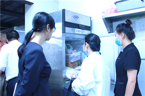 刘娅一行先后来到学校商铺围炉花园和学生六食堂,对餐厅就餐环境、后厨卫生、食品原料采购、存储、加工检验等环节进行了详细检查。在对围炉花园的检查过程中,刘娅及安全员查看了餐厅后厨生食柜,检查食品生产日期及保质期,仔细翻阅了餐厅的食品安全信息公示信息,指出食品安全信息需每日填报,切不可虚假填写。
