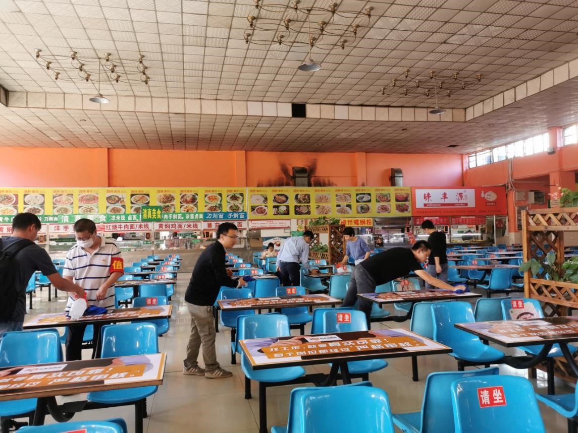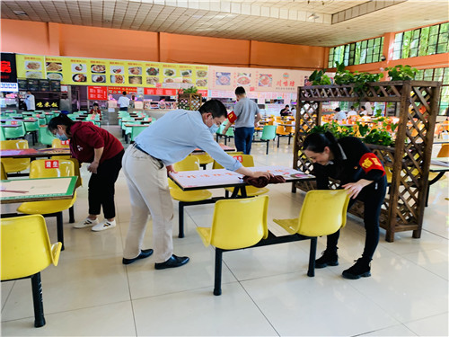 活动中,全体党员手拿毛巾、喷壶、拖把、扫帚等清洁工具和消毒器材分头行动,清理学生第一食堂及周边杂草、垃圾,对食堂内桌椅、售卖窗口、操作间等公共区域的设施设备进行消毒杀菌,向就餐师生宣传疫情防控、爱国卫生运动相关知识,引导师生养成文明就餐、杜绝浪费的行为习惯,共同给师生营造了一个干净整洁健康舒适的就餐环境和卫生秩序,助力学校复学后的疫情防控工作。(文/图:袁林静 袁健)