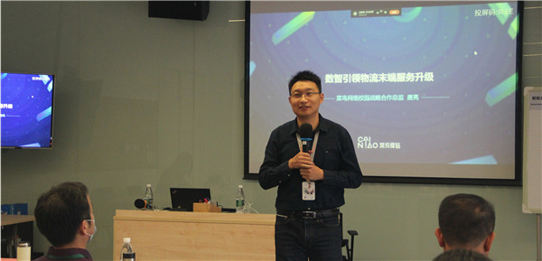 阿里巴巴菜鸟校园驿站战略合作总监唐亮致辞。他代表菜鸟网络欢迎各位学员来到阿里巴巴园区参加培训,并表示菜鸟网络将通过协会平台更好服务于高校,推动高校现代化建设发展。