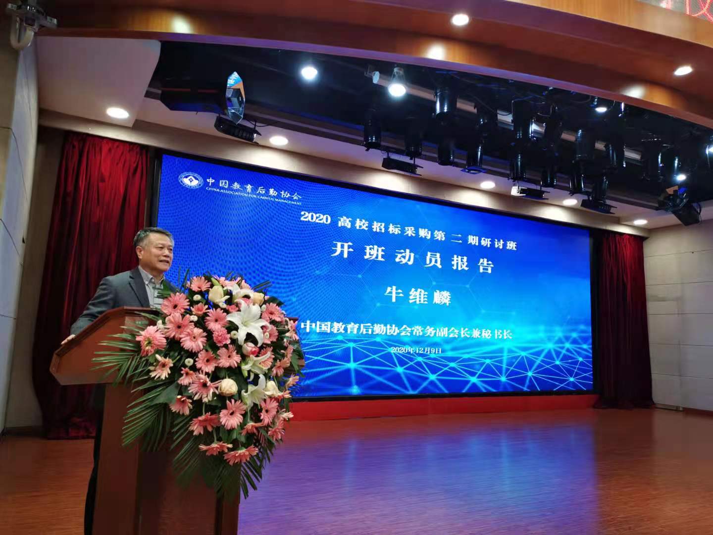 中国教育后勤协会常务副会长兼秘书长牛维麟作开班动员讲话。牛维麟指出,随着高等教育事业的快速发展,高校年度采购预算不断提高,招投标采购工作越发频繁,采购规模越来越大。国家一系列关于招标采购法律法规的出台,进一步促进了高校招标采购的规范化、法制化,同时也促进了规范透明、公平竞争、监督到位、问责严格的高校招标采购工作机制的建立和完善。招标采购工作是高校工作中的热点和难点,也是风险点,必须严格依法依规,始终坚持公平、公正,才能把这项工作做实做稳、干出成效。牛维麟还介绍了中国教育后勤协会概况及协会当前正在着力推进的高校节能、节水、节粮等重点工作。