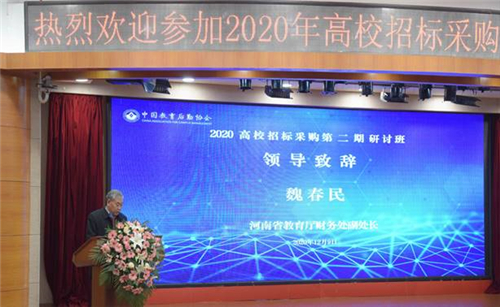 在开班仪式上,受河南省教育厅领导委托,河南省教育厅财务处副处长魏春民发表了热情洋溢的致辞,欢迎各地高校领导、专家及企业负责人来洛阳参加招标采购研讨活动,并向大家介绍了洛阳璀璨的历史文化和河南省教育发展的有关情况。