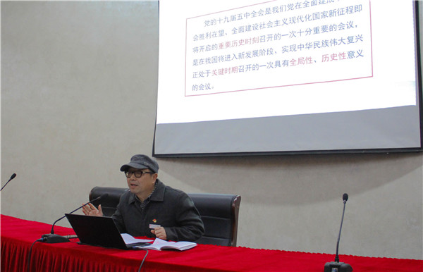 报告会上,徐云庆围绕“从历史和全局的高度深刻认识党的十九届五中全会的重大意义”、“深刻领会党的十九届五中全会的丰富内涵和精髓要义”以及“深入学习贯彻中央和省委决策部署,谋划实施好学校未来发展蓝图”三大方面对党的十九届五中全会精神进行了宣讲,并结合当前形势就其中出现的党政热词进行了深入解读。
