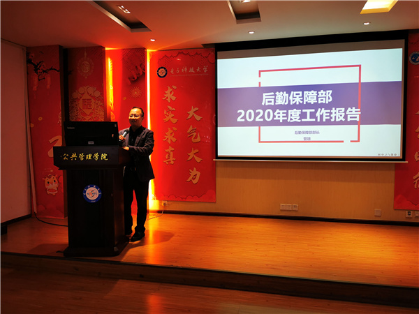 后勤保障部部长曾翎做《2020年度工作报告》,提出2021年工作目标任务,并就2020年度财务收支和奖酬金分配情况向代表们作汇报。他表示,过去一年,后勤保障部在学校党政的正确领导和全体员工的共同努力下,以目标为导向主动落实各项工作任务,以问题为导向着力解决存在突出问题,以服务为导向不断强化保障能力建设,各项工作圆满完成。特别是在疫情防控工作中,主动担当作为,时刻牢记师生利益高于一切,在“吃、住、用、行”等方面全心全意为师生做好后勤服务保障。