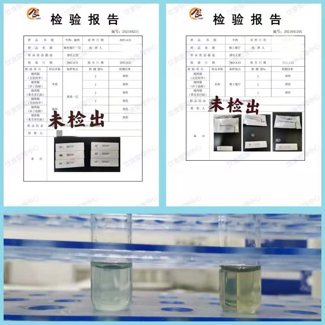 中国矿业大学总务部饮食管理中心高度关注“瘦肉精”问题,严格把控,一方面加强对原材料合格供方的管理及索证索票,另一方面做好“瘦肉精”快速检测工作。食品安全快检室利用胶体金检测卡对所有餐厅使用的鲜猪肉、鲜牛肉、鲜羊肉分五批次抽检,分别进行莱克多巴胺、盐酸克伦特罗、沙丁胺醇三种常见“瘦肉精”检测,抽检结果较好,所有样品均未检出“瘦肉精”。同时,饮食中心食品安全快检室也对这些样品进行了新鲜度检测,均判定为健康新鲜肉。