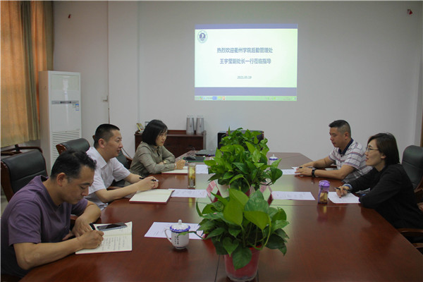 5月19日下午,衢州学院后勤管理处副处长王宇莹一行来嘉兴学院后勤考察交流餐饮管理及后勤内控制度等方面工作。后勤服务有限公司总经理吴国祥、副总经理周华丽及饮食管理服务中心主任周吉参加交流,会议由吴国祥主持。