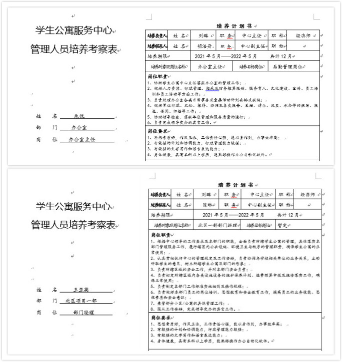 7位管理人员的加入是对学生公寓现有员工队伍的岗位补充,同时也为后续管理和技术骨干的培养做好准备。中心领导班子结合岗位情况和她们自身的特点、优势,量身定制了《学生公寓服务中心管理人员培养考察表》,并分别担任培养负责人和培养联系人,对她们在今后一段时间内的阶段性培养目标和工作任务进行了细化分解,同时对于各自所承担的专项工作任务,如标准化建设的推进、品质后勤课题研究的思考、公寓文化建设方案的拟定等都做出了详细的目标要求。相信在领导和同事们的关心指导和帮助下,各位新同事们将在工作中学习,在学习中成长,不断提升自己,融入团队,为后勤学生公寓的发展贡献力量。(学生公寓中心 蒋琳)