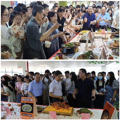 延续以往,今年也特别设立了“全鱼宴”展台,位于松苑餐厅一层,共有22道“色香味意形”俱全的特色菜肴,吸引了大批师生前往。中国矿业大学党委书记刘波,校长宋学锋,副校长赵建岭,校党委副书记、纪委书记付恒升莅临现场,总务部党委书记、部长陈仲元,总务部原党委书记张惠忠全程陪同,并与在场学生亲切交流。12:00,校党委书记刘波在同学们的热情簇拥下高兴且自豪地宣布:“今天是矿大112岁的生日,祝贺矿大112岁生日快乐!同学们,吃鱼吧!”一度将现场气氛推向顶端。