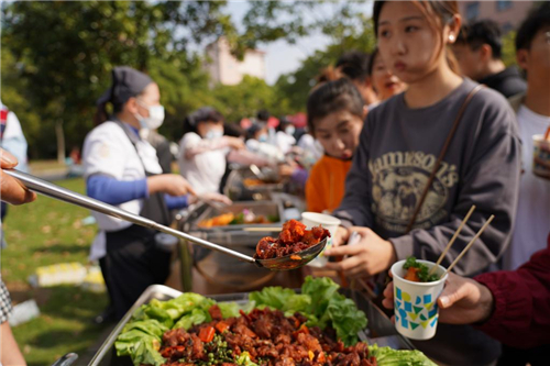 在厨艺秀如火如荼开展的同时,在广场的另一角,本次活动的另一大主题,生态美食展也吸引了一众师生的注目。一个个特色小吃展位,被食客团团包围,炒酸奶、肉夹馍、烤冷面、鸡翅包饭……不同地域的小吃品种让人眼花缭乱,大家拿着手里的,吃着嘴里的,又忍不住凑过去瞧一瞧。纵使众口难调,在这里也可以得到充分的满足。
