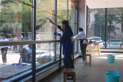 保洁员岗位技能比赛(玻璃清洁)两人一组,来自公寓中心、物业中心、餐饮中心共30人参加比赛。选手们按照抽签顺序依次上场,着装整洁,精神抖擞,凭借赛前练习和日常工作积累的经验,个个动作娴熟,展现出了深厚的技术功底和良好的精神面貌。周慧琼根据操作步骤、程序规范、保洁质量对参赛选手进行打分并逐个点评,提出了意见、建议。