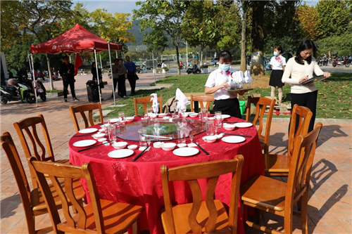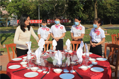 中式摆台技能比赛包括中餐台布铺设、餐具摆放、口布折花、拉椅定位等环节,接待餐厅、印象农林餐厅11位员工参加比赛。在比赛现场,每位参赛选手都全身心投入其中,凭借丰富的实操经验展示了摆台技能。王海霞针对各个参赛选手的表现进行了现场打分和点评。
