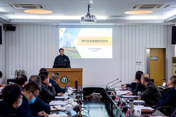 镇江华润燃气有限公司安全管理部主管刘奇斌以湖北十堰“6.13”燃气爆炸事件为引,结合高校用气特点,从管道天然气及危险特性、燃气泄露安全保护系统、燃气用户在相关法律法规中的责任和义务等方面为大家进行燃气安全方面的知识普及。镇江华润燃气有限公司安全稽查大队大队长史国勤结合燃气泄露引起的人身伤亡的案例,强调了燃气安全的重要性,他希望各高校高度重视,提高警惕。