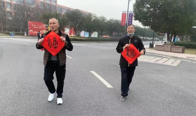 校园里四季桂淡雅清香、大白鹅歌声嘹亮,虽是冬日,但已能感到春意。饮食服务中心的员工们绕景行湖漫游,欣赏校园美景,同时拿起福字来个合影。有的员工说“希望新的一年家人都健康快乐”;有的说“祝愿同学们都能学业有成”;有的说“祝大家新年新气象,虎虎生威!”
