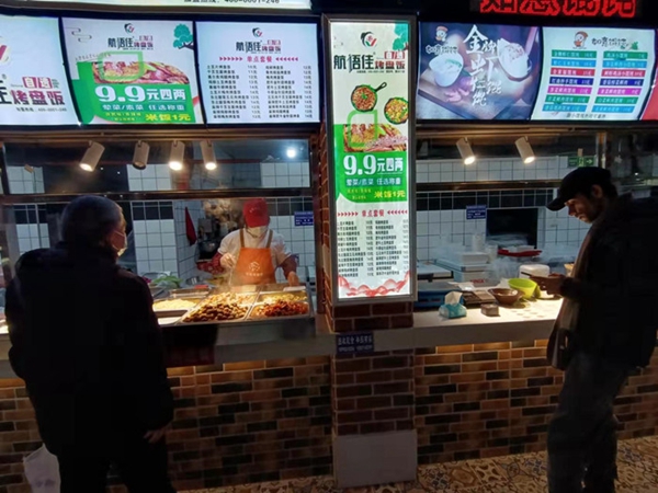 为保障饮食服务,南、北区食堂一直开放坚持营业,为春节留校的师生提供可口的饭菜。上午十一点不到,北区食堂的高师傅夫妇准备荤素搭配的饭菜已经出炉,饺子、馄饨保障供应。冒雪来进餐的师生,吃着热腾腾的饭菜,心里暖暖的。其中有一位操着标准的中文的巴基斯坦留学生告诉我,他已经在湖北工业大学学习4年了,现在是研究生一年级,春节留校,餐饮服务、水电服务有保障,校园干净靓丽,美极了:“我爱湖北工业大学”,这是一位留学生暖暖的心声。