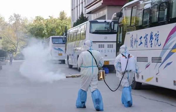 兰州工商学院自3月16日起禁止外来人员和车辆入校,为保障师生基本生活不受影响,后勤管理处立即抽调人员组成货物转运组,所有到校货物由货物转运组在校门外从配送车辆上卸货后,进行严格消杀,消杀完成后由学校车辆转运到指定位置,坚决将疫情潜在风险阻断在校门外。