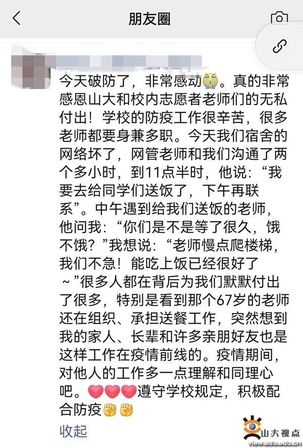 在为同学们提供志愿服务的过程中,教职工志愿者们收到了很多同学们的感谢和感动,一声声“老师们你们辛苦了”“谢谢老师们”“向您学习为同学们服务”“老师慢点爬楼梯,我们不急”……在传递正能量的同时,也让教职工志愿者们的心里充满了获得感与干劲儿。疫情终会散去,但流动在师生间的这种师生一心、共抗疫情的默契,互相体谅、充满奉献与感动的美好,会一直在校园中传播、扩散,成为这段难忘的回忆中,最温暖的底色。